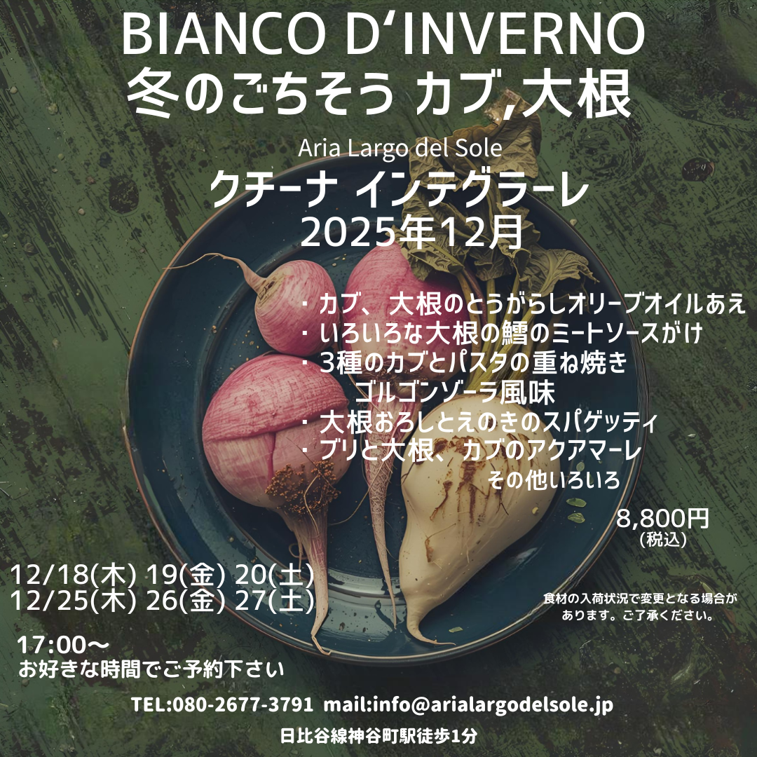 クチーナインテグラーレ「BIANCO D`INVERNO 冬のごちそう カブ、大根」開催 12月 5, 2025 PER GRAZIA DEL SOLE クチーナ インテグラーレ 12月のご案内 「BIANCO D`INVERNO 冬のごちそう カブ、大根」 冬の訪れとともに、カブと大根が最も美味しくなる季節がやってきました。 今月のクチーナインテグラーレは、この冬野菜を主役に、伊崎シェフのイタリア料理の感性で仕立てた料理をご用意いたします。 滋味深い冬野菜の甘味と香りをワインと共にゆっくりとお楽しみください。 〇開催日 ・12/18(木) ・12/19(金) ・12/20(土) ・12/25(木) ・12/26(金) ・12/27(土) アリアラルゴデルソーレの会員に関わらずご来店いただけますので、お気軽にご予約ください。 ご予約はこちら