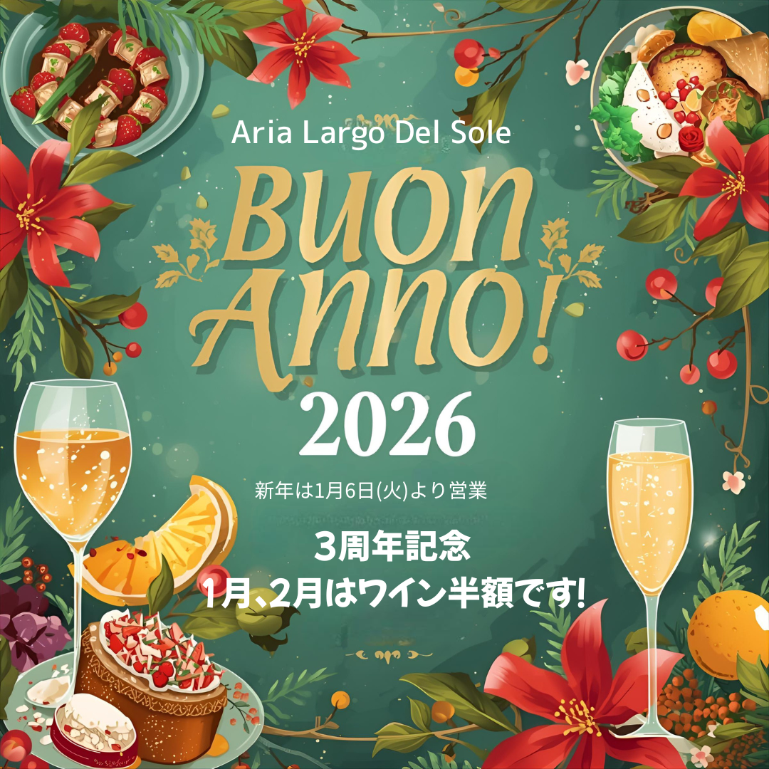 BUON ANNO!! 1月 1, 2026 PER GRAZIA DEL SOLE クチーナ インテグラーレ BUON ANNO!! 新年、あけましておめでとうございます。 本年も皆様にとって素晴らしい1年でありますように。 本年もどうぞよろしくお願いいたします。 伊崎裕之 2026年元旦 ~ おかげさまで3周年!! ~ アリアラルゴ デル ソーレは、昨年12月に3周年を迎えました。 皆さまへの感謝の気持ちを込めて、3周年記念のワイン半額イベントを1月~2月で行います。 アリアラルゴ デル ソーレの会員にかかわらず、ご利用いただけます。 この機会にぜひお越しください。 皆さまのご来店、心よりお待ちしています。 ※ご予約は、お店へ直接ご連絡ください。