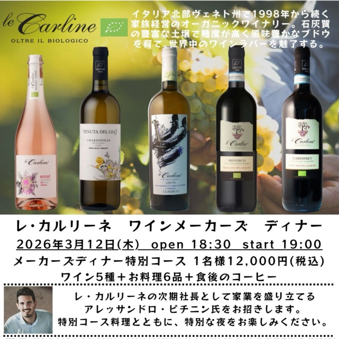 イタリア北部ヴェネト州のオーガニックワイナリー〈レ・カルリーネ〉を迎える、3月12日だけの特別ディナー。